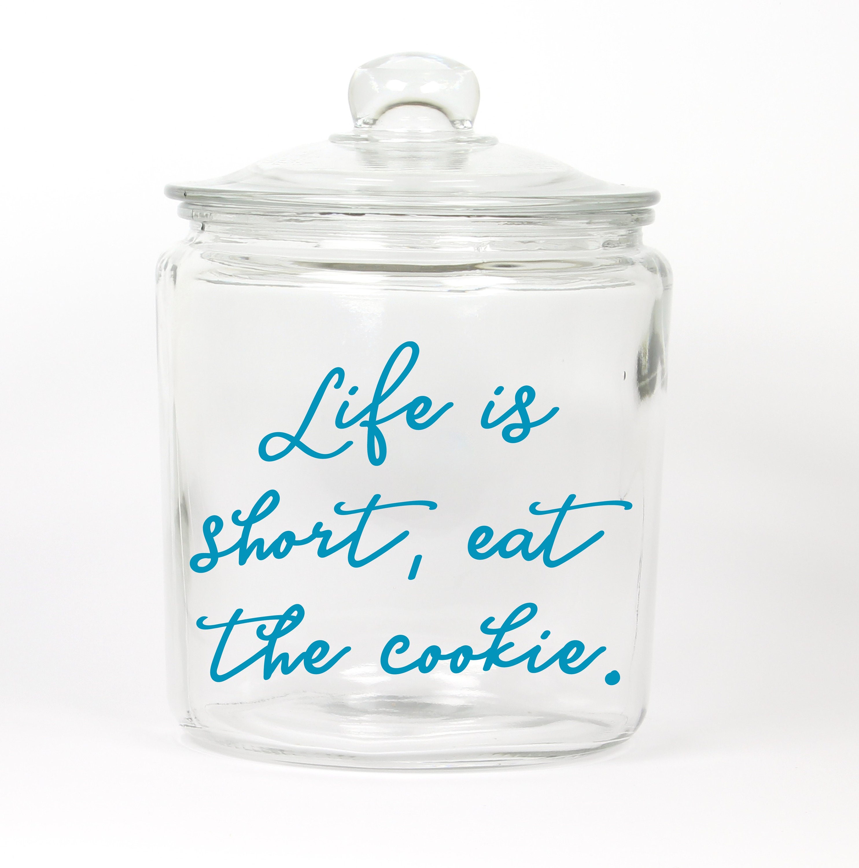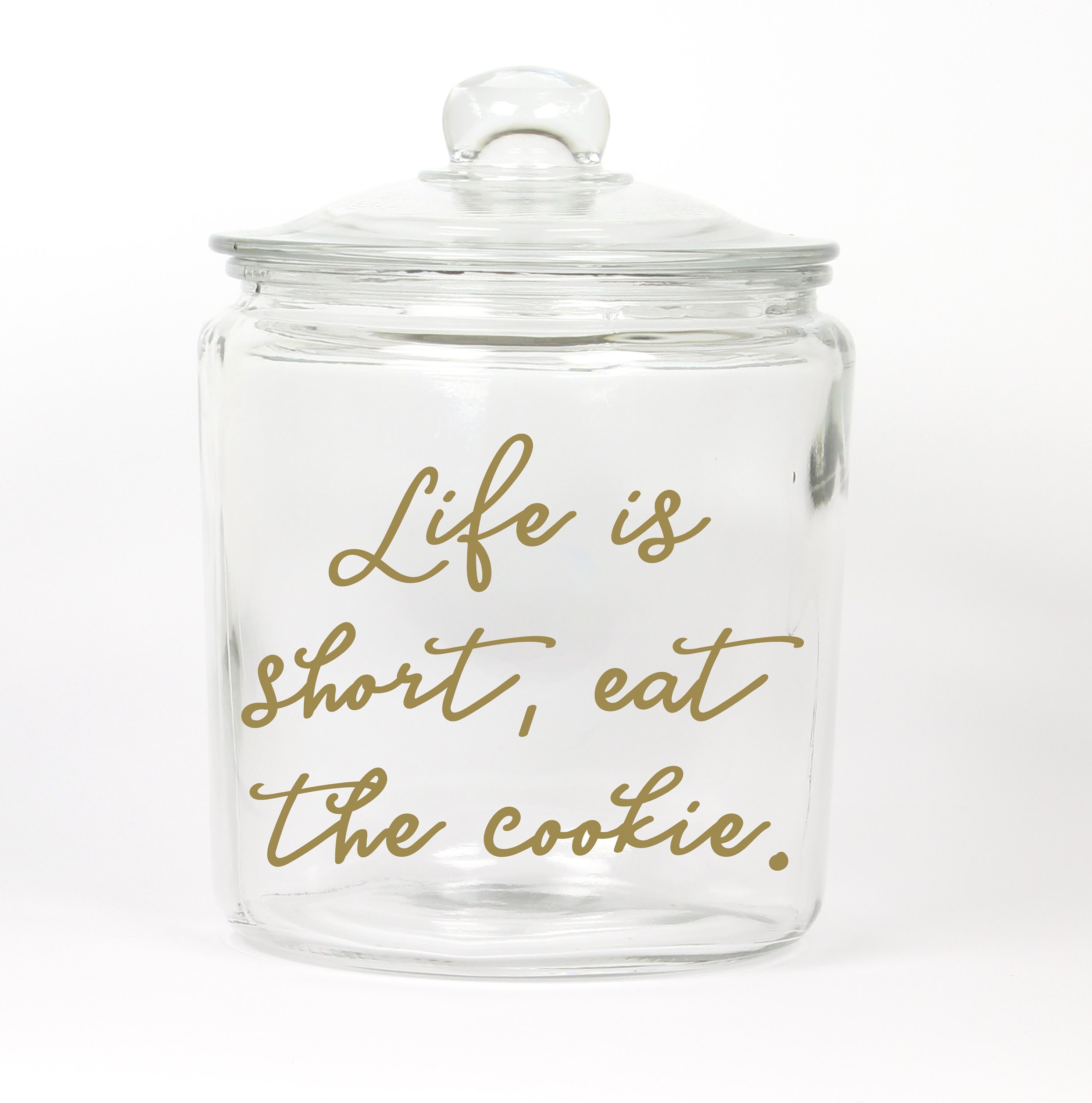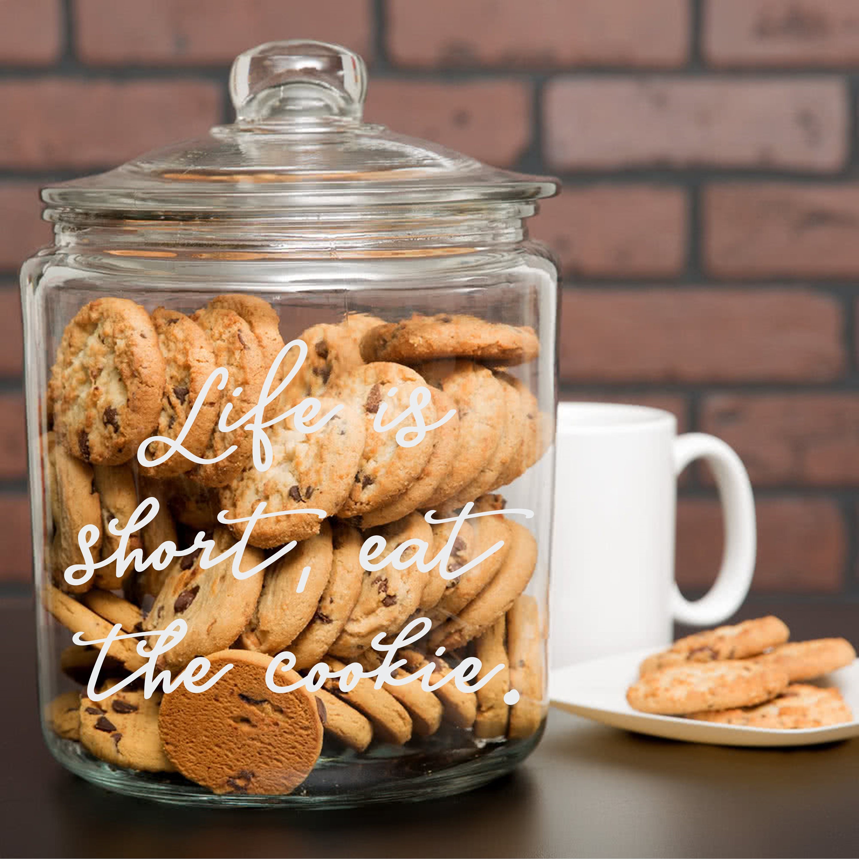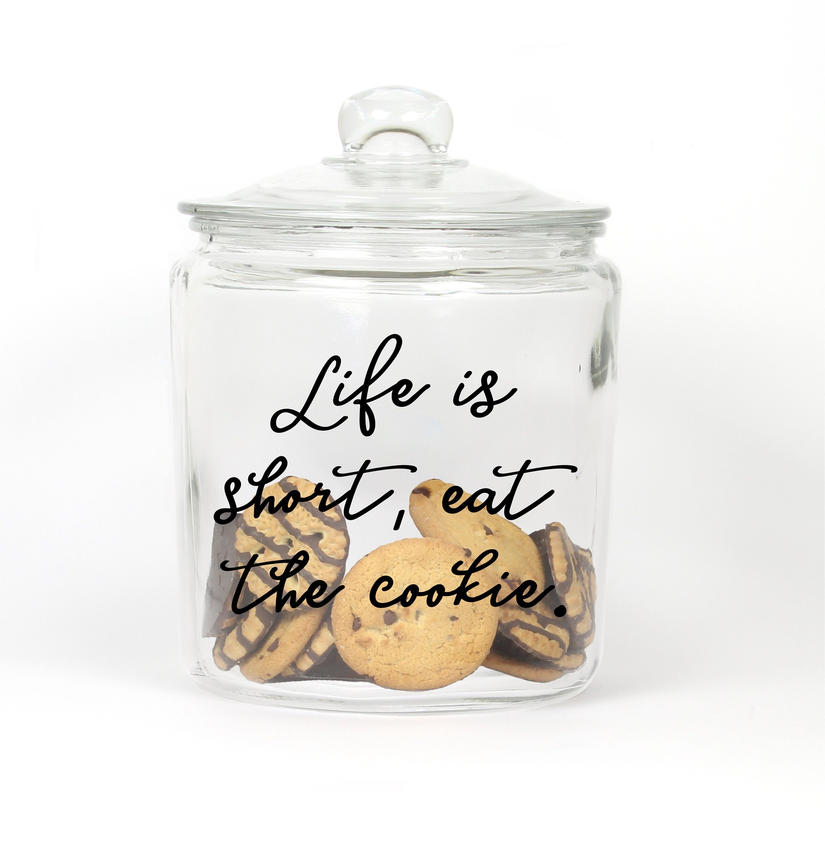 Perfect display for anyone's homemade goodies. Jar says: Life is short, eat the cookie.