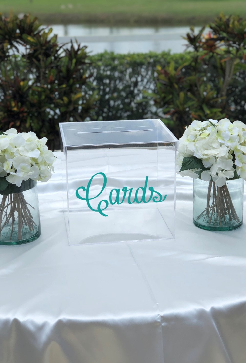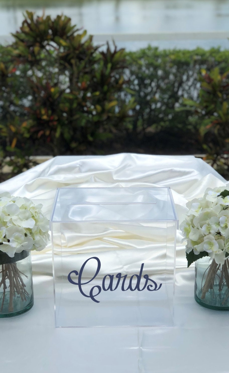 Beautiful clear acrylic card box for any occasion! Great for weddings, graduations, funerals, holiday parties and more. Choose from our solid, metallic or new sparkle colors. We also offer the card box blank with no personalization. Each box is handmade and polished from clear acrylic and features a 7" card slot.