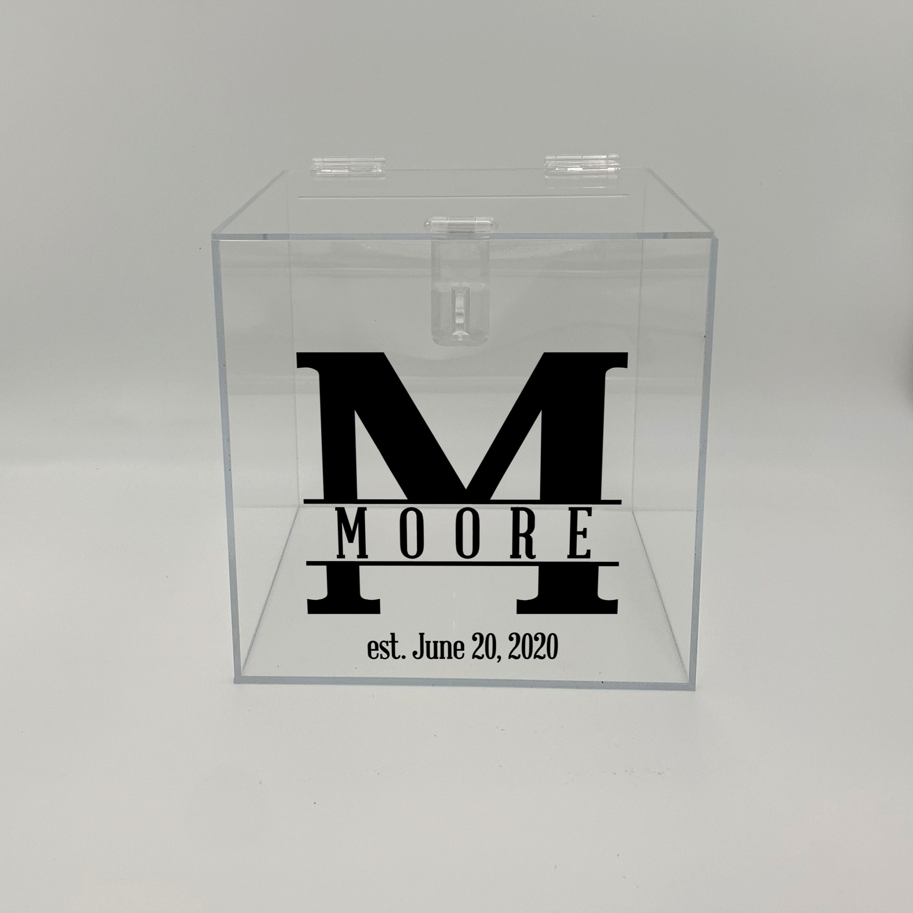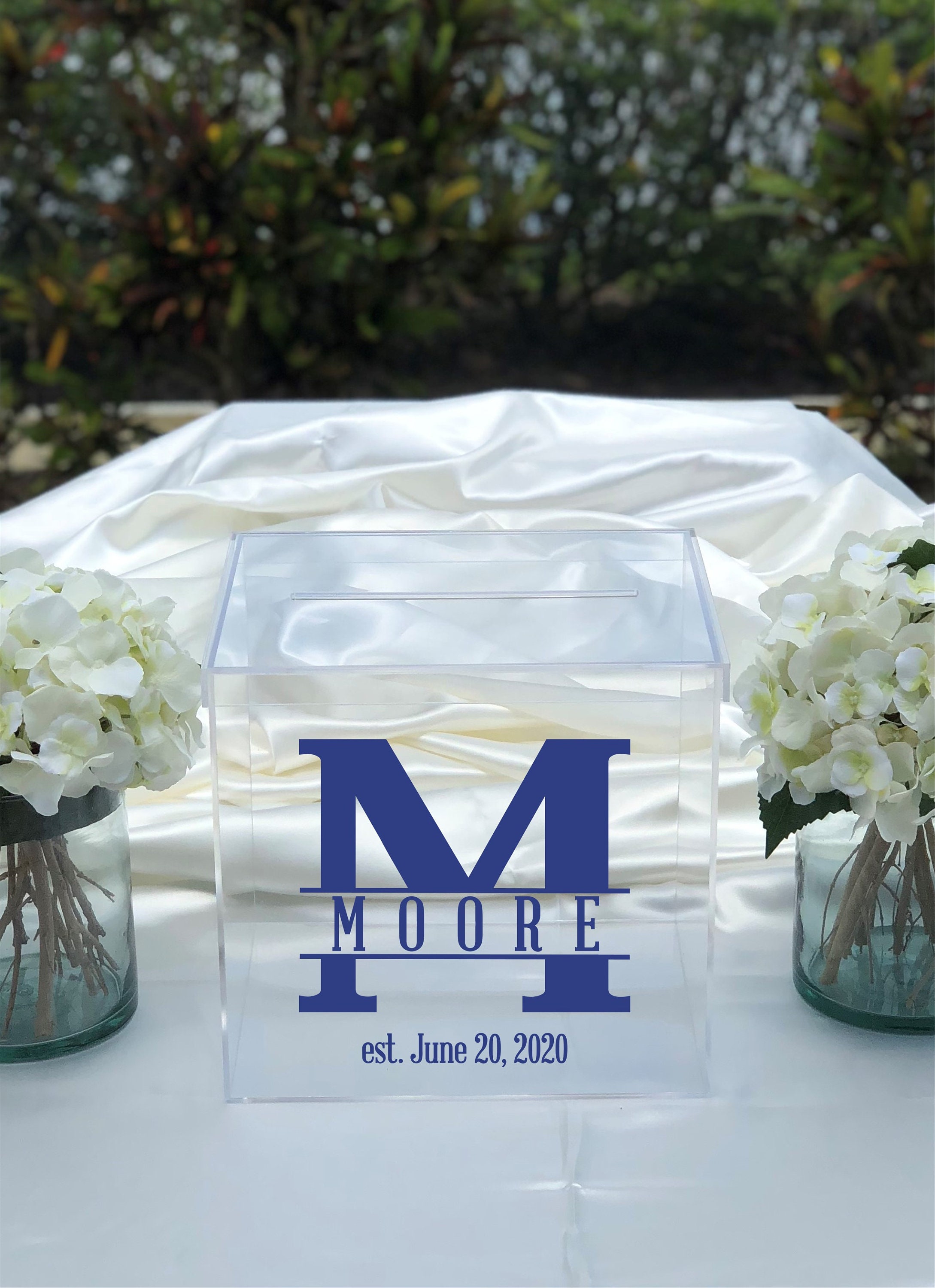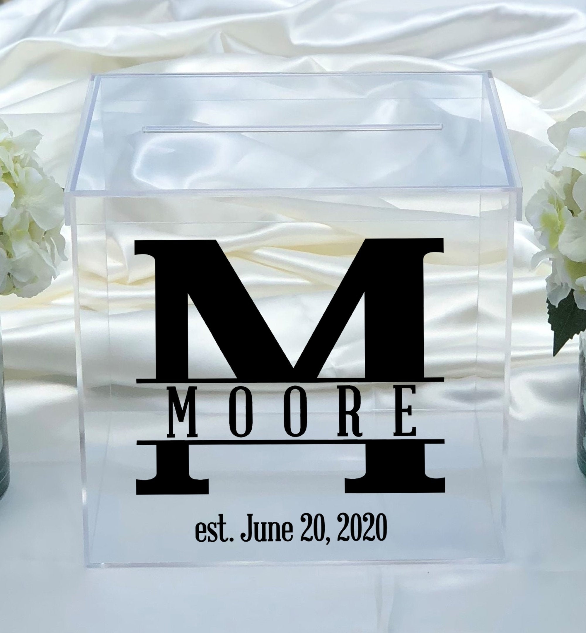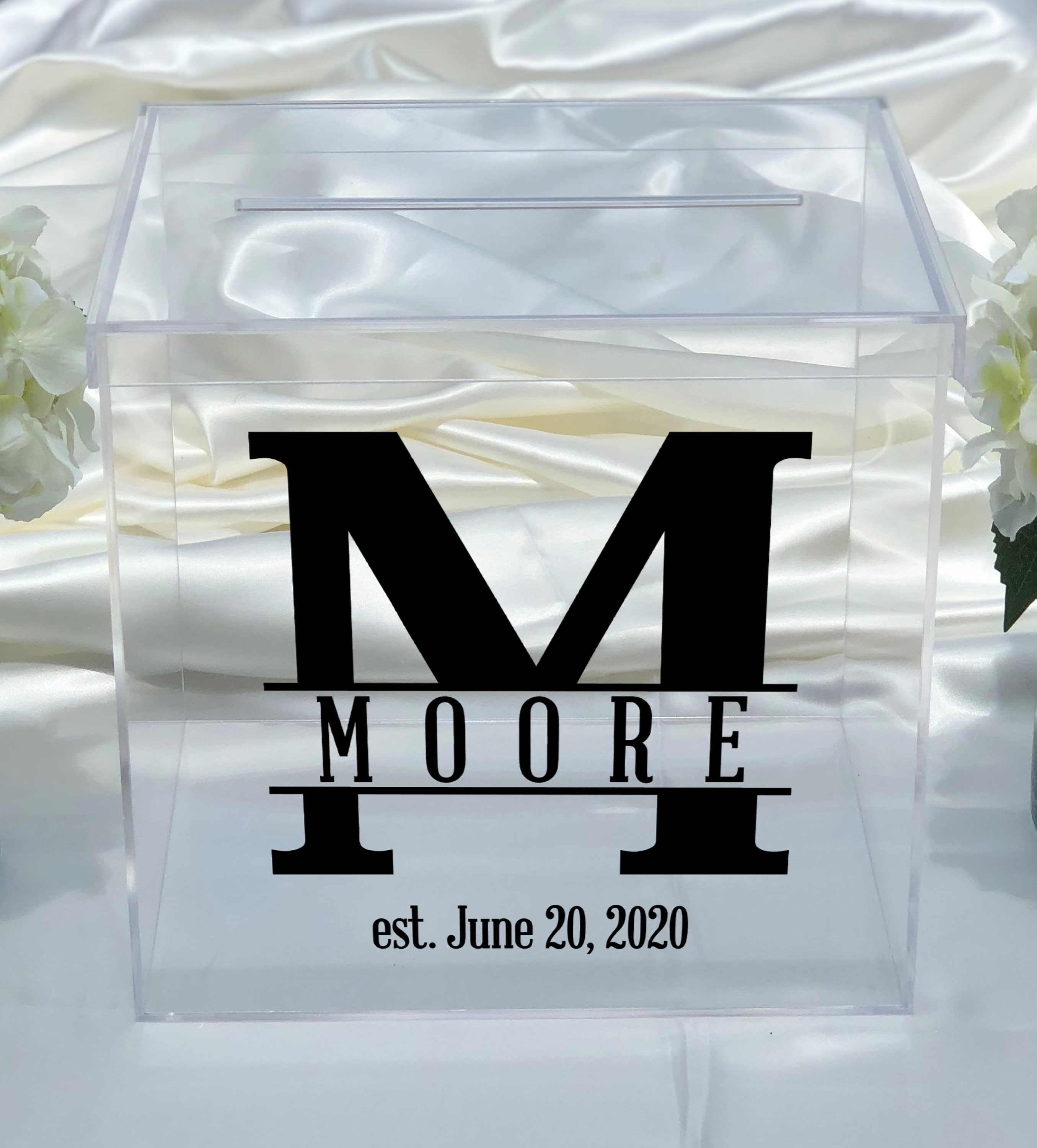 Use this clear acrylic card box for your wedding! Personalized with any Name and Date in the color of your choice. Choose from our solid, metallic or new sparkle colors. We also offer the card box blank with no personalization. Each box is handmade and polished from clear acrylic and features a 7" card slot.