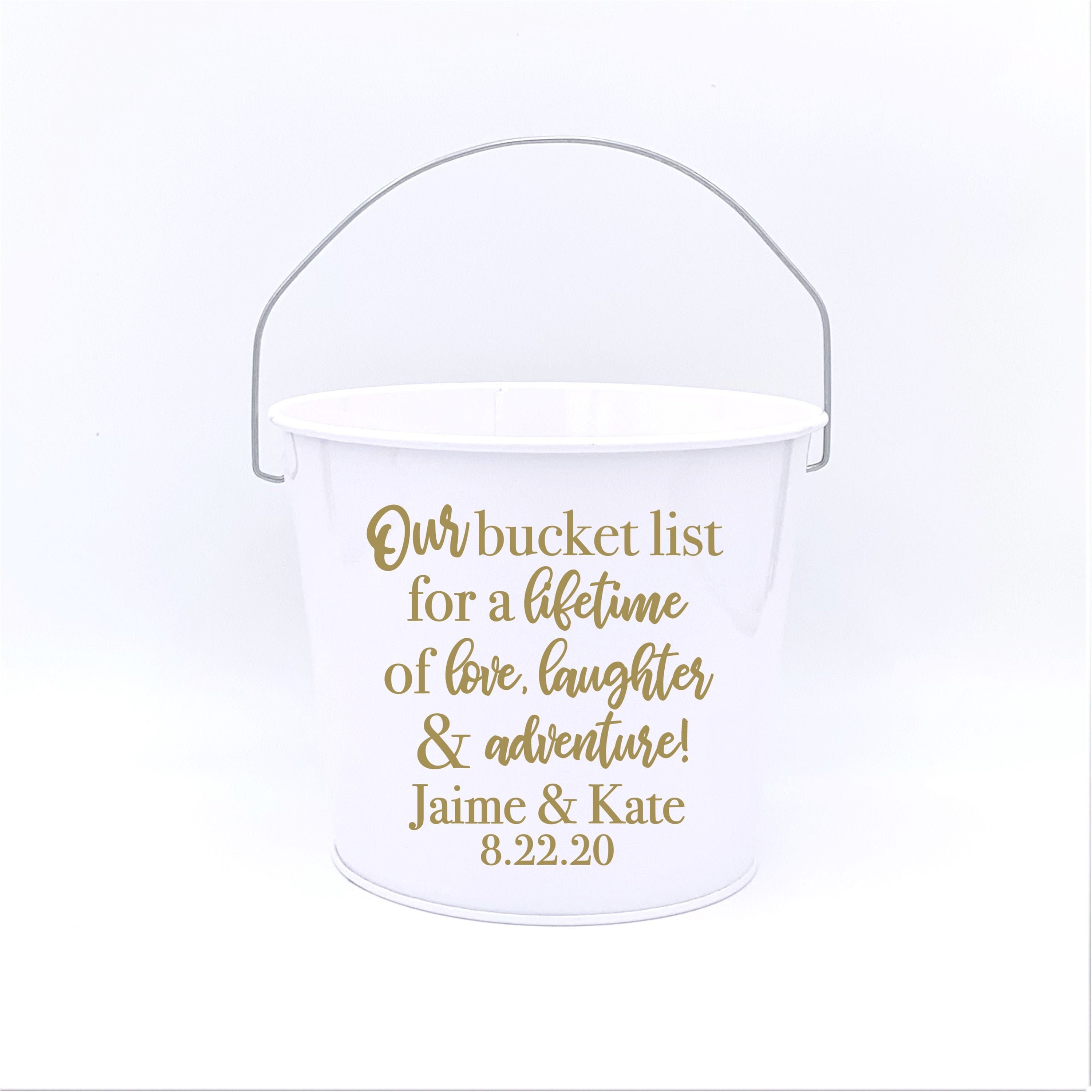An amazingly fun & creative guest book alternative, a bucket list! Bucket reads, "Our Bucket List For A Lifetime of Love, Laughter, & Adventure" and personalized with any two names and a date you'd like. You even get to choose the colors.