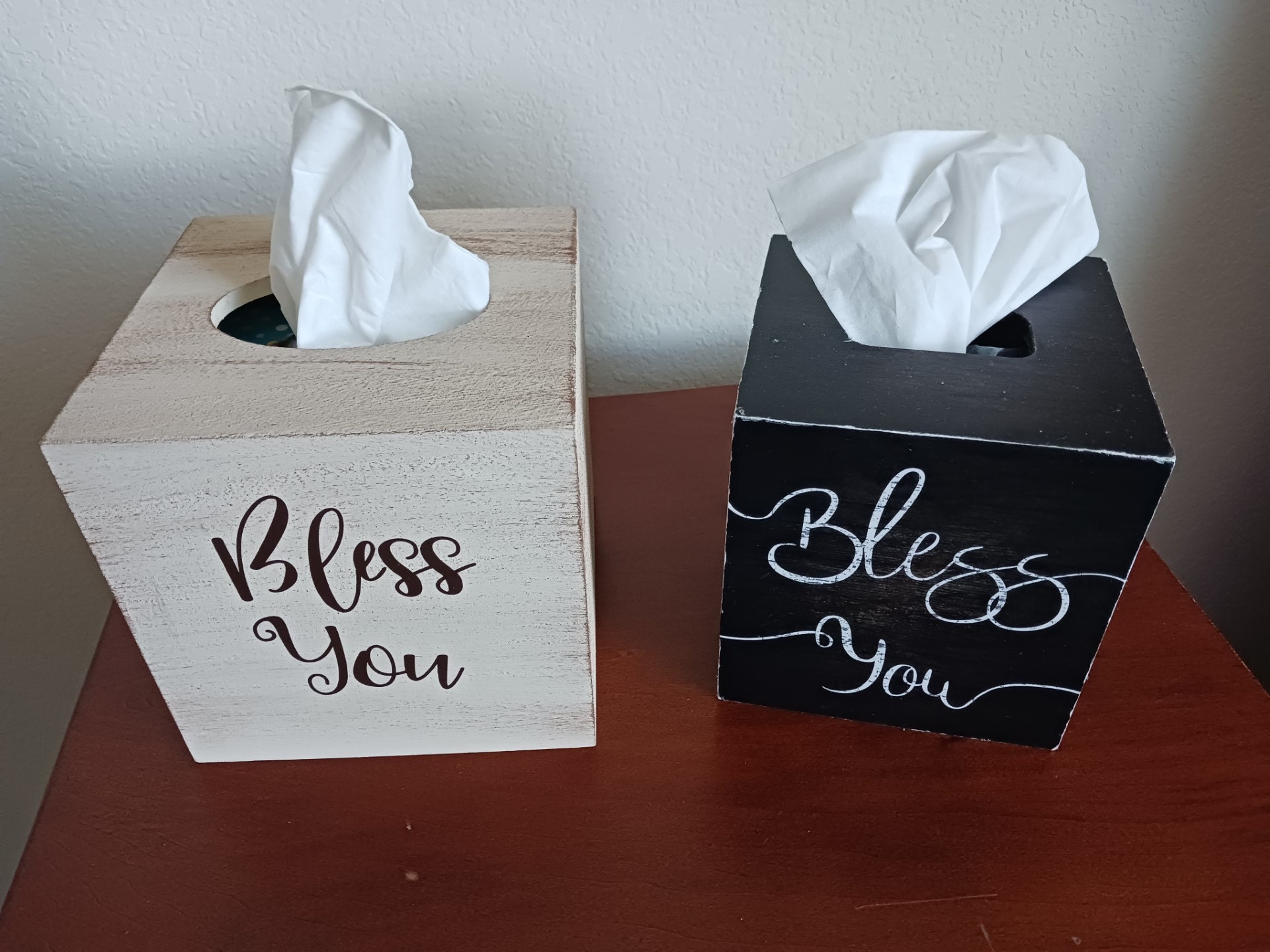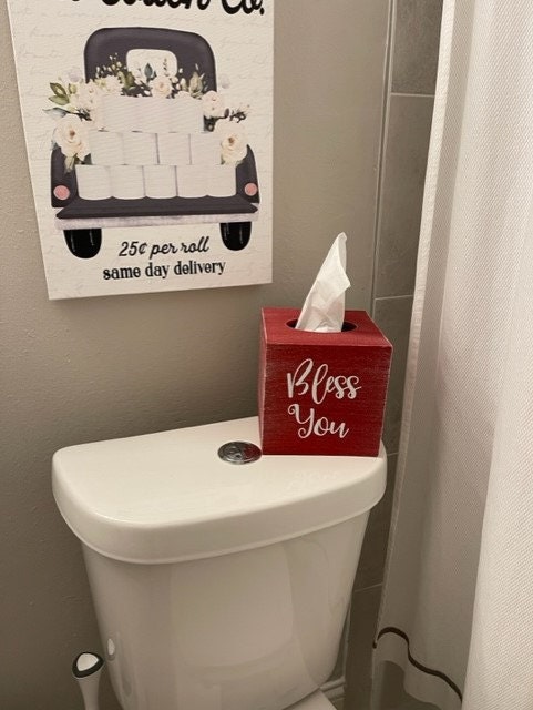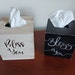 Beautiful oversized tissue box cover. It is painted in your favorite color with the lettering in the color of your choice. Match your home décor. It accommodates a standard square box of tissues. Measures 6" square and is 6" tall.