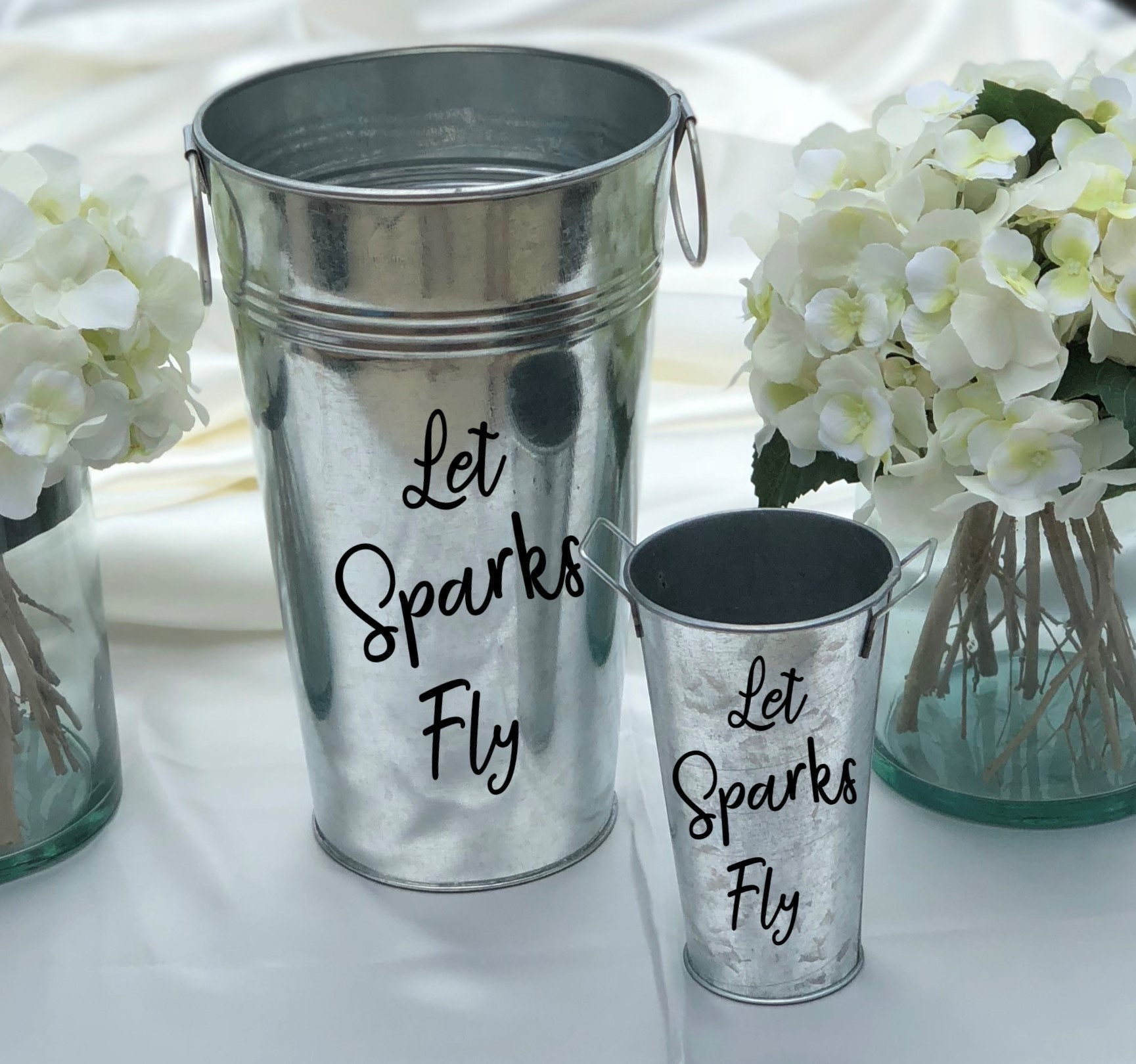 This fun, rustic chic tin pail that reads Let Sparks Fly! A perfect tin to hold your sparklers for your wedding or celebration!