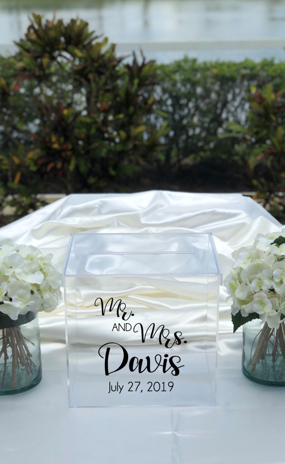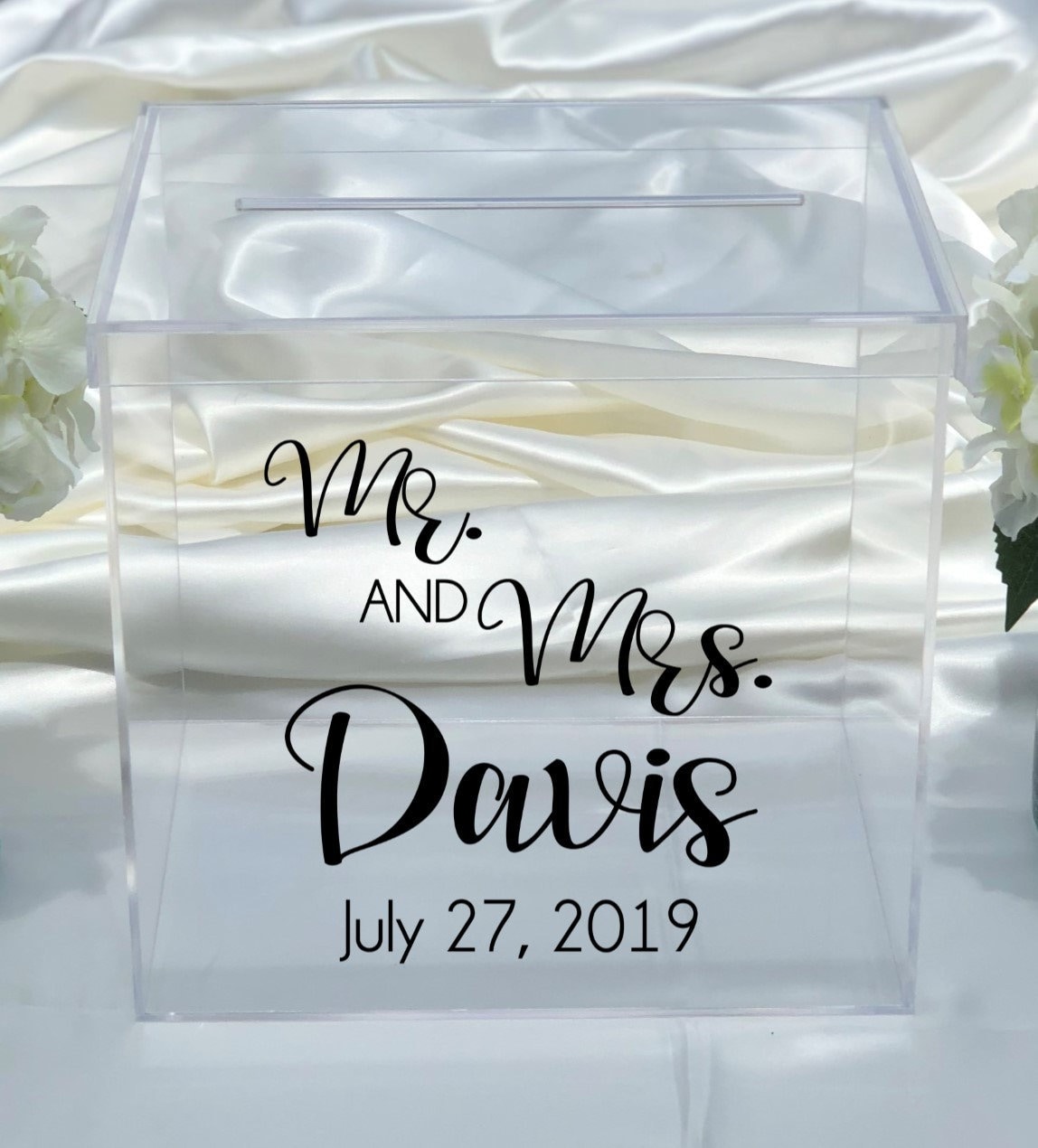Beautiful clear acrylic card box would make the perfect decoration for your wedding! Personalized with any Titles, Last Name and Date in the color of your choice. Choose from our solid, metallic or new sparkle colors. We also offer the card box blank with no personalization. Each box is handmade and polished from clear acrylic and features a 7" card slot.