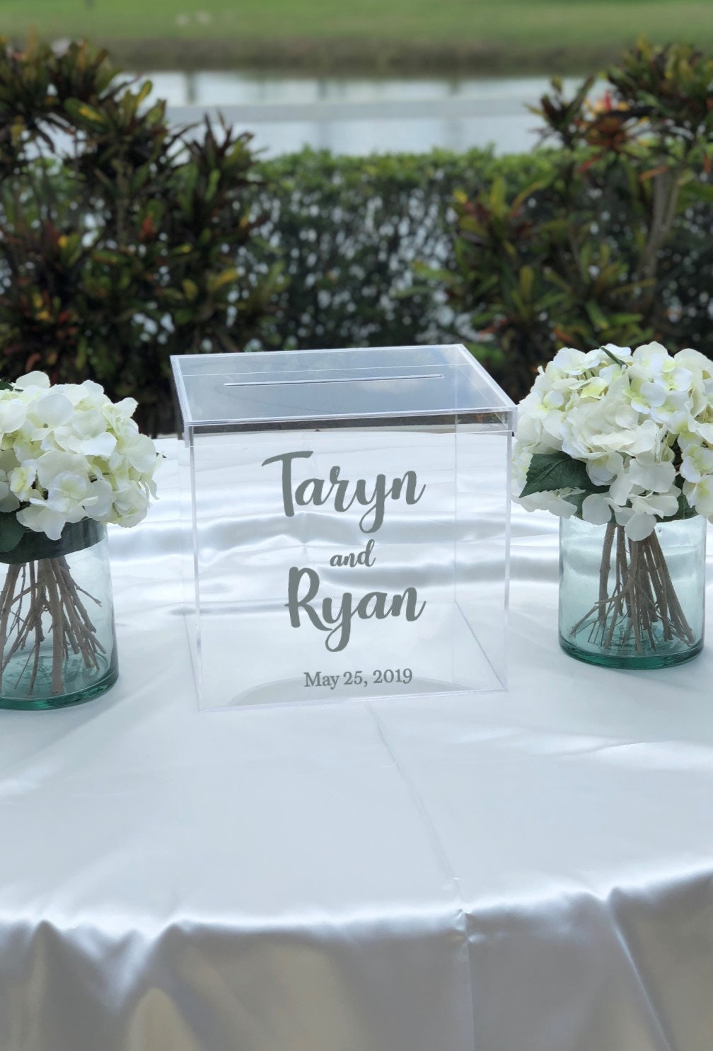 Beautiful clear acrylic card box would make the perfect decoration for your wedding! Personalized with any First Names and Date in the color of your choice. Choose from our solid, metallic or new sparkle colors. We also offer the card box blank with no personalization. Each box is handmade and polished from clear acrylic and features a 7" card slot.