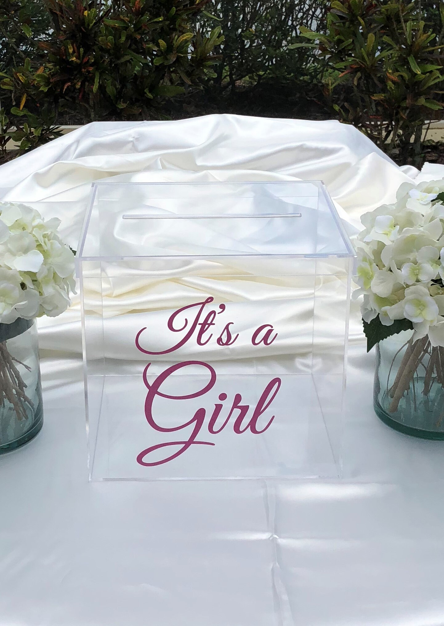 Beautiful clear acrylic It's A Girl card box for your baby shower! Shown in Pink Sparkle.