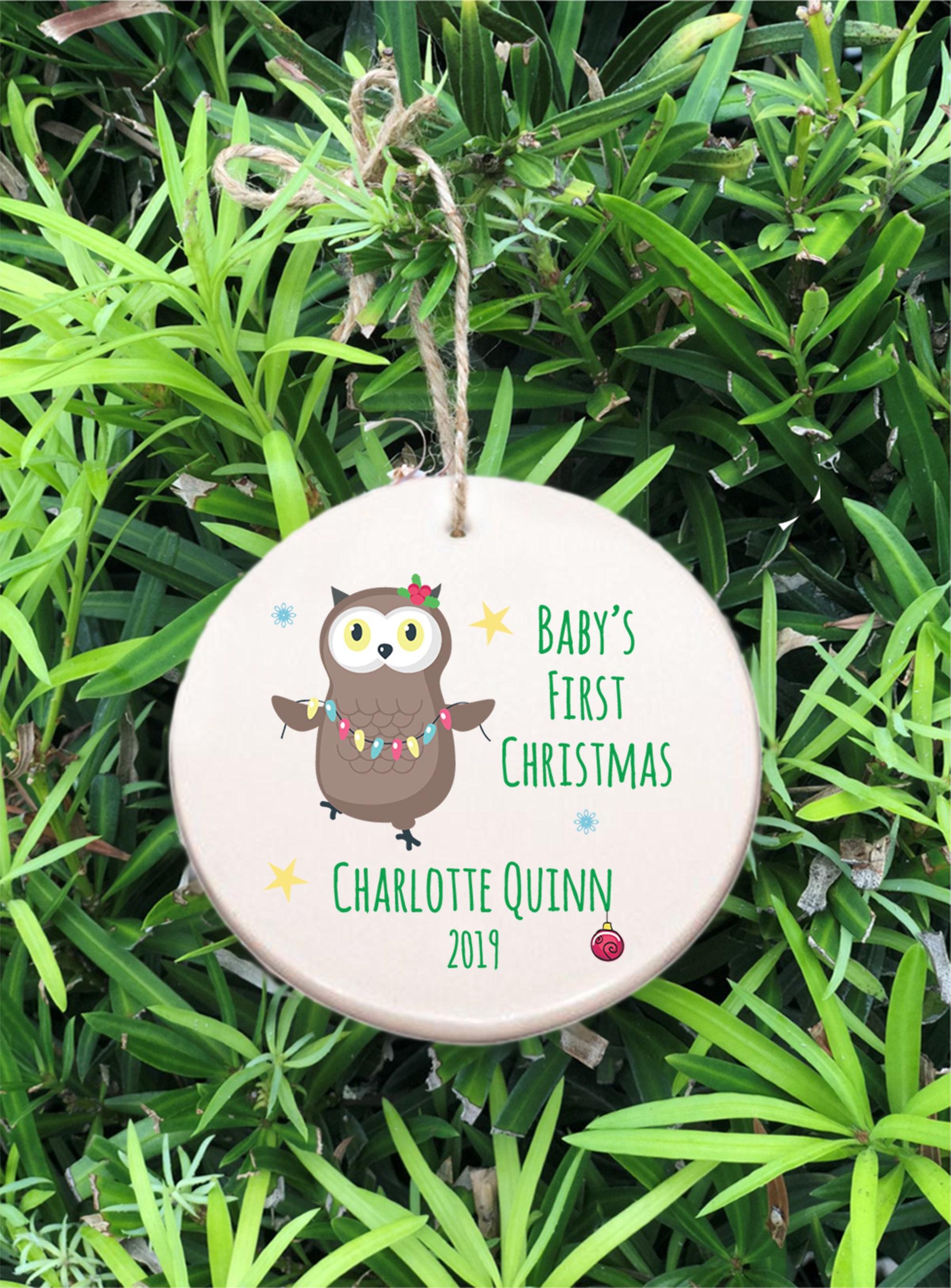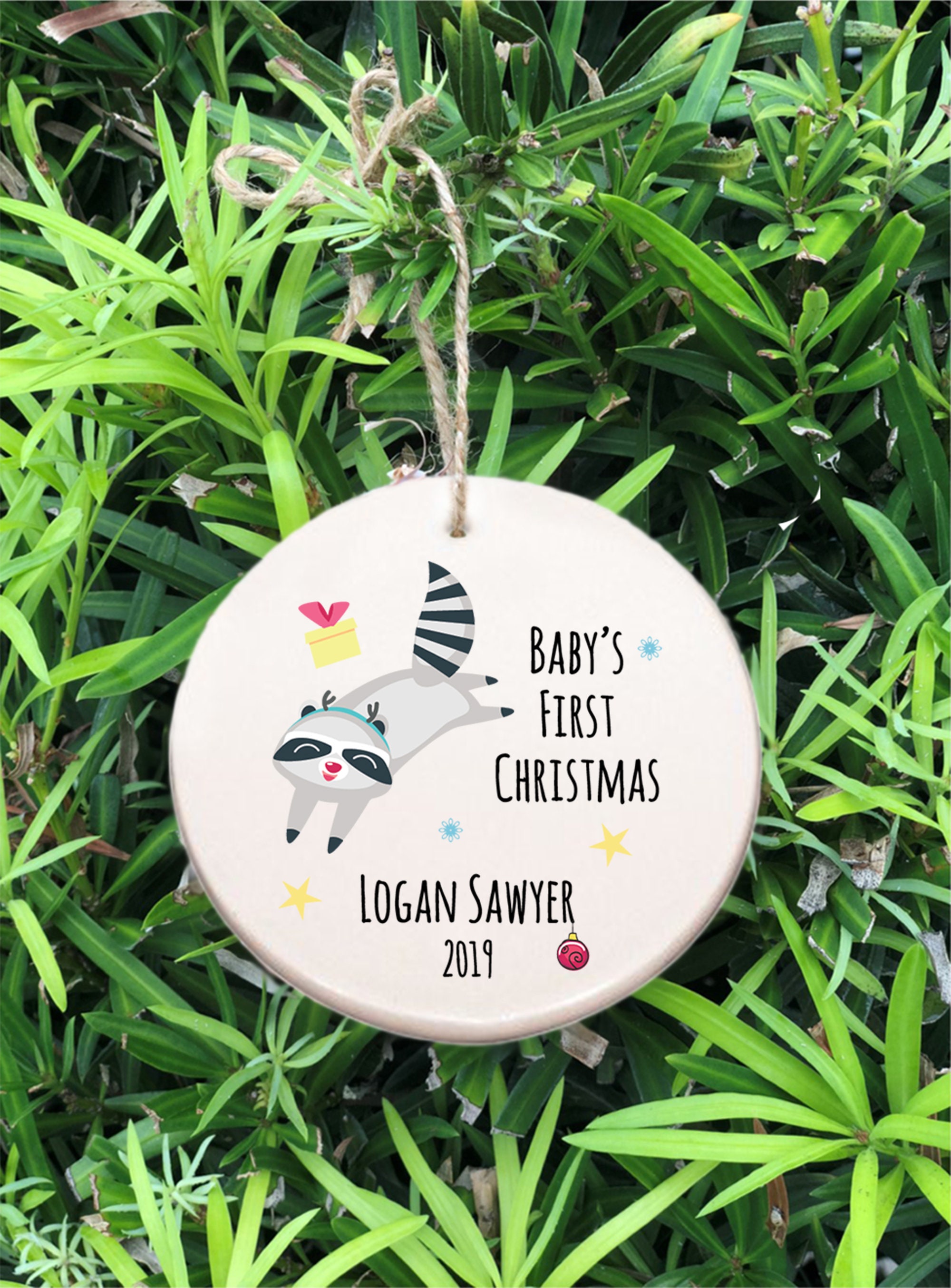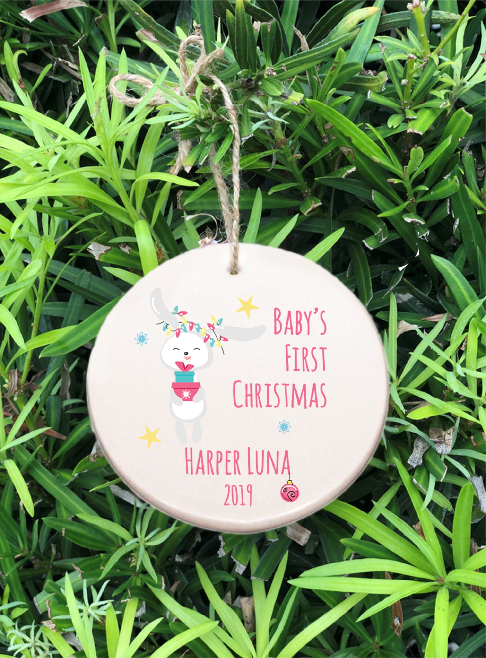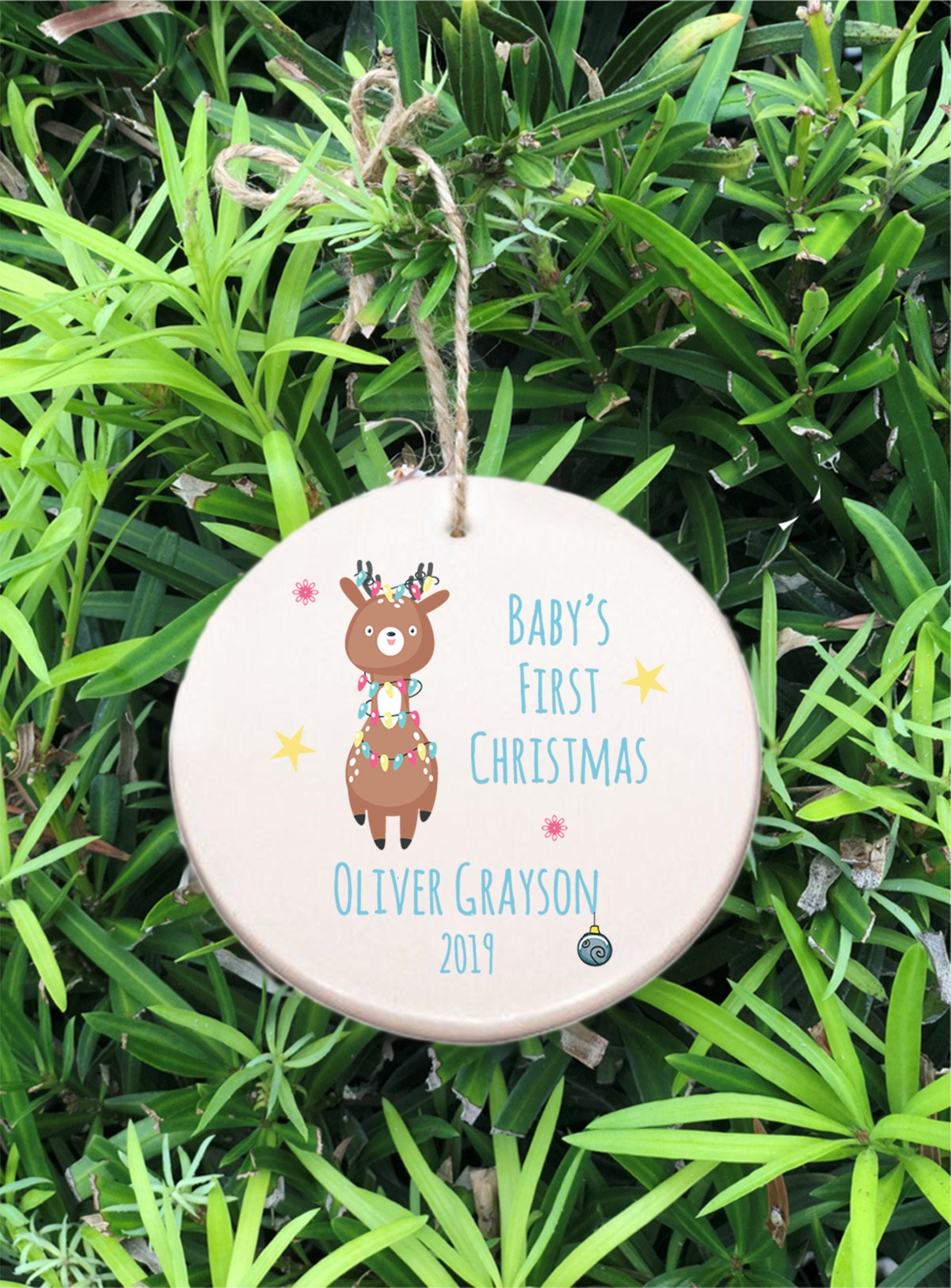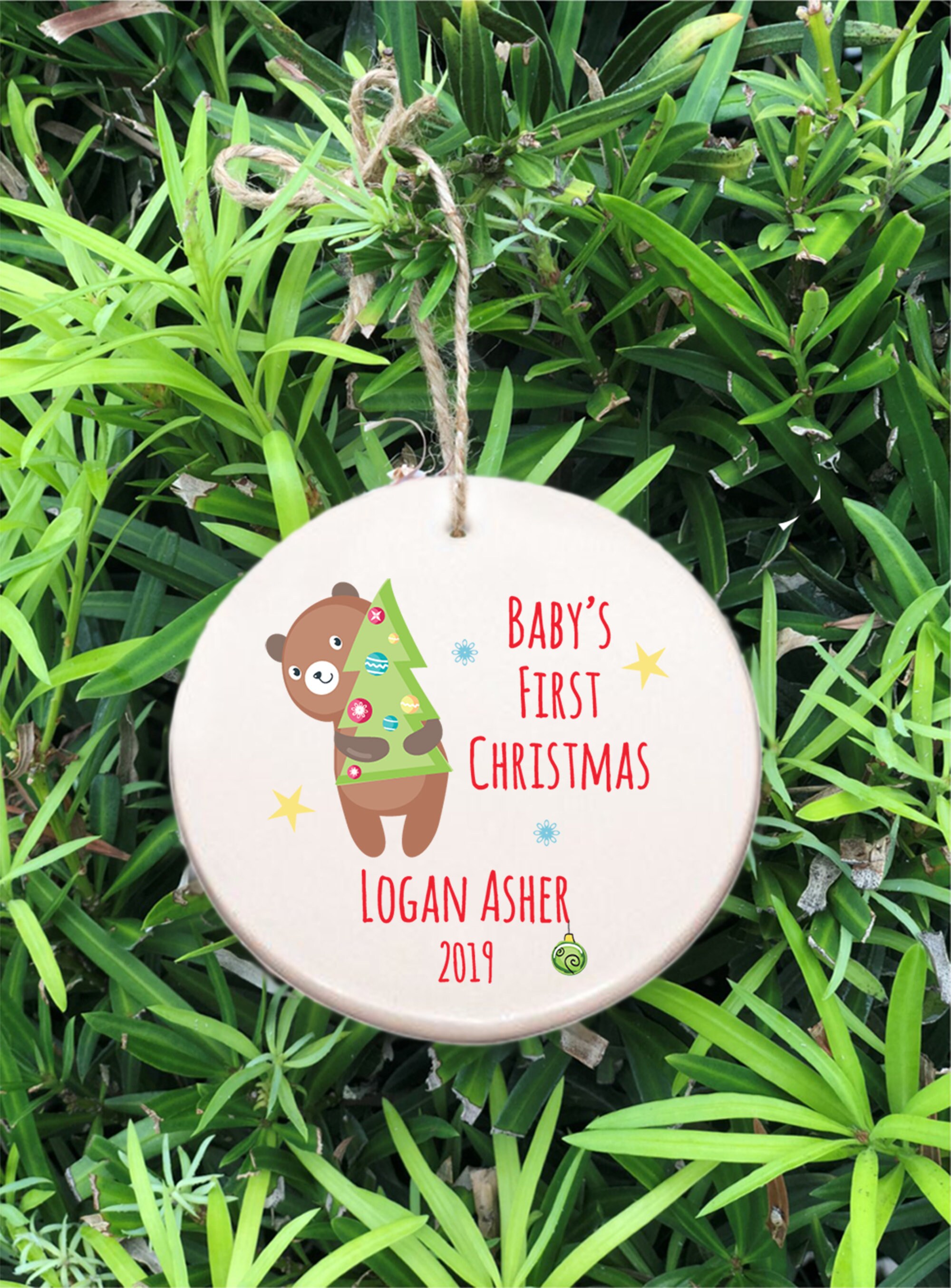 Celebrate a baby's first holiday with this adorable ornament. It will be a beautiful keepsake that will be cherished for a lifetime. This ceramic ornament measures 2.75" in diameter x 1/8" thick and comes with a gold string for hanging on the tree.