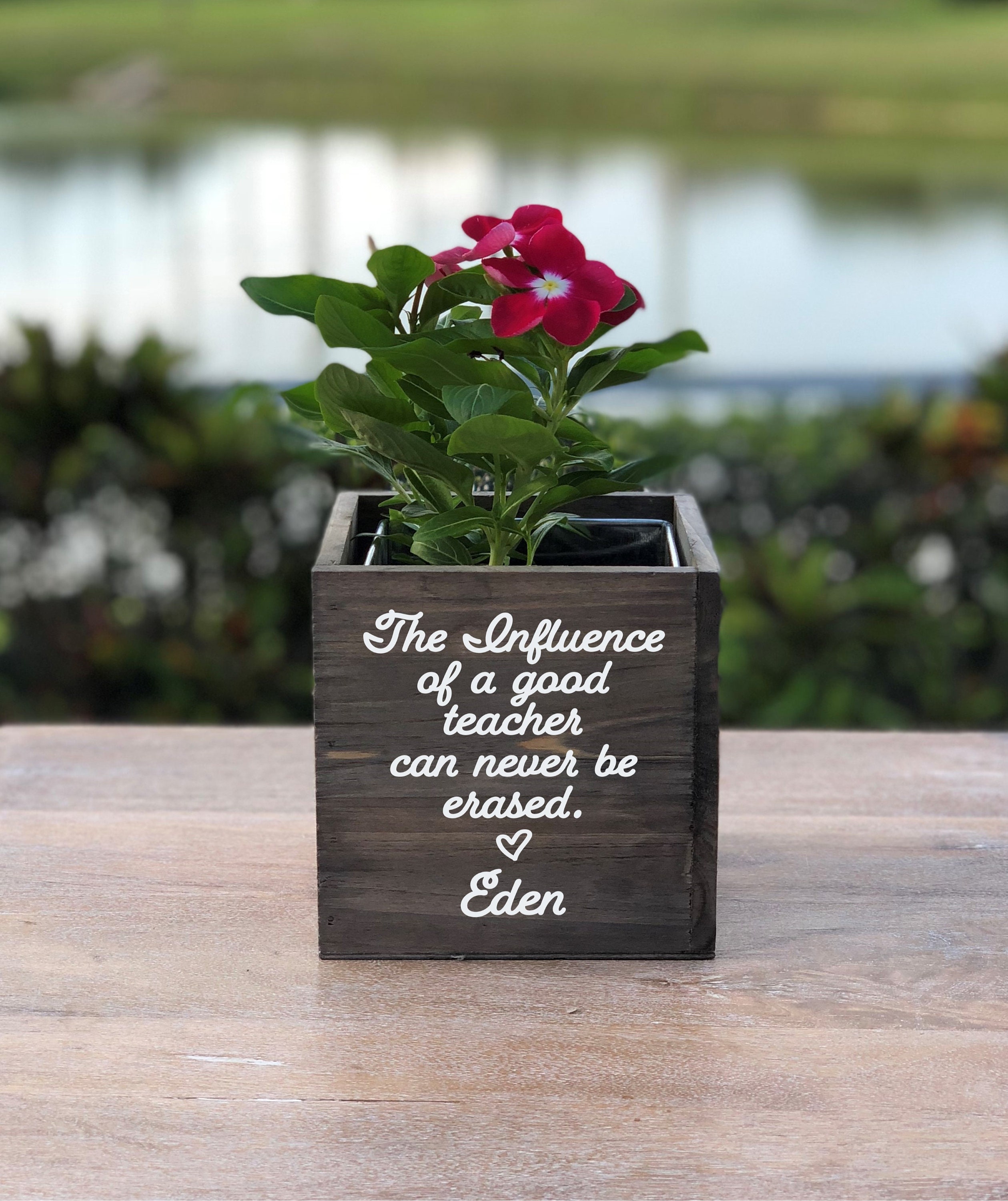 Our planter boxes include a zinc liner for your convenience. Other wording will be as shown. Flowers are not included.