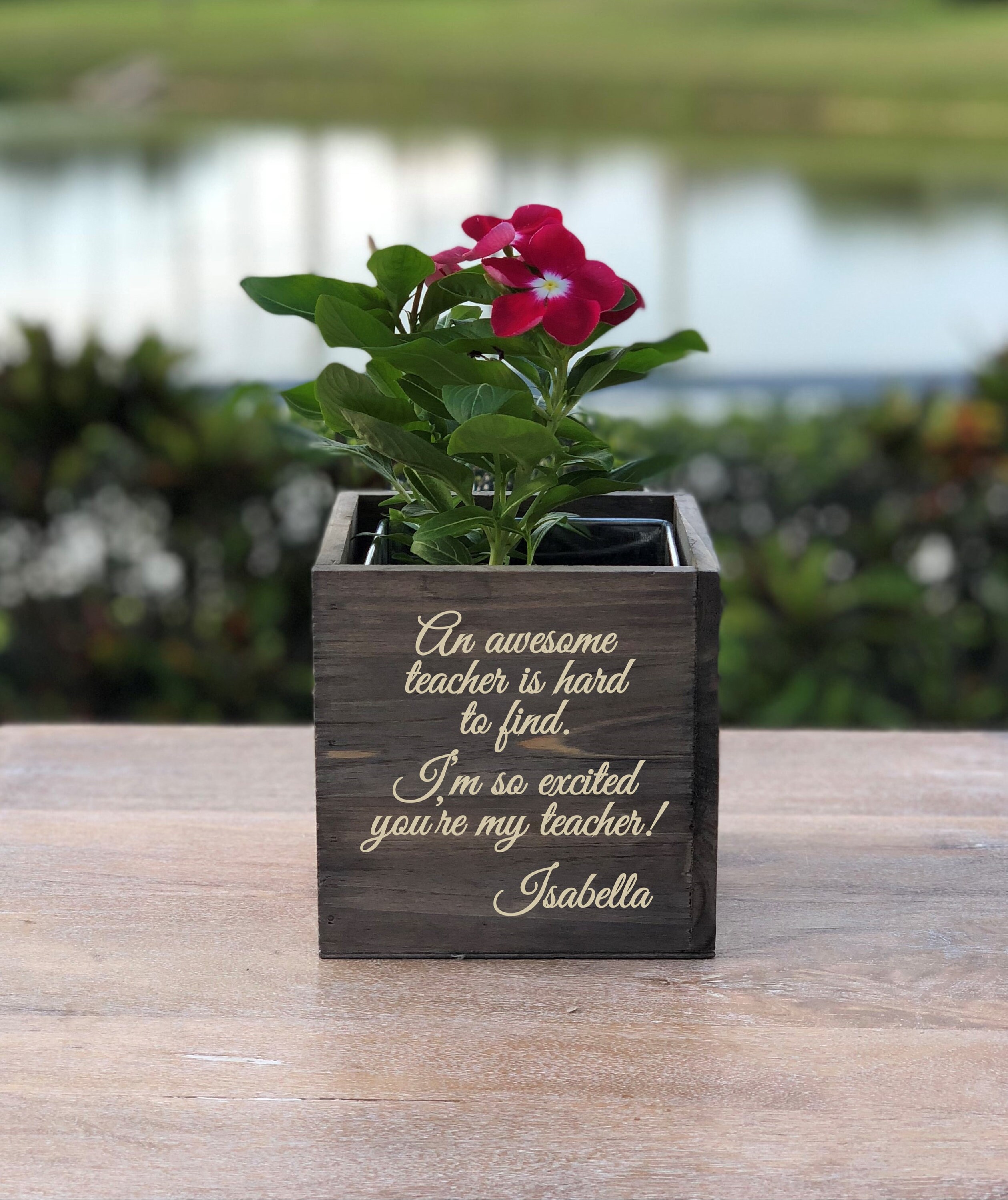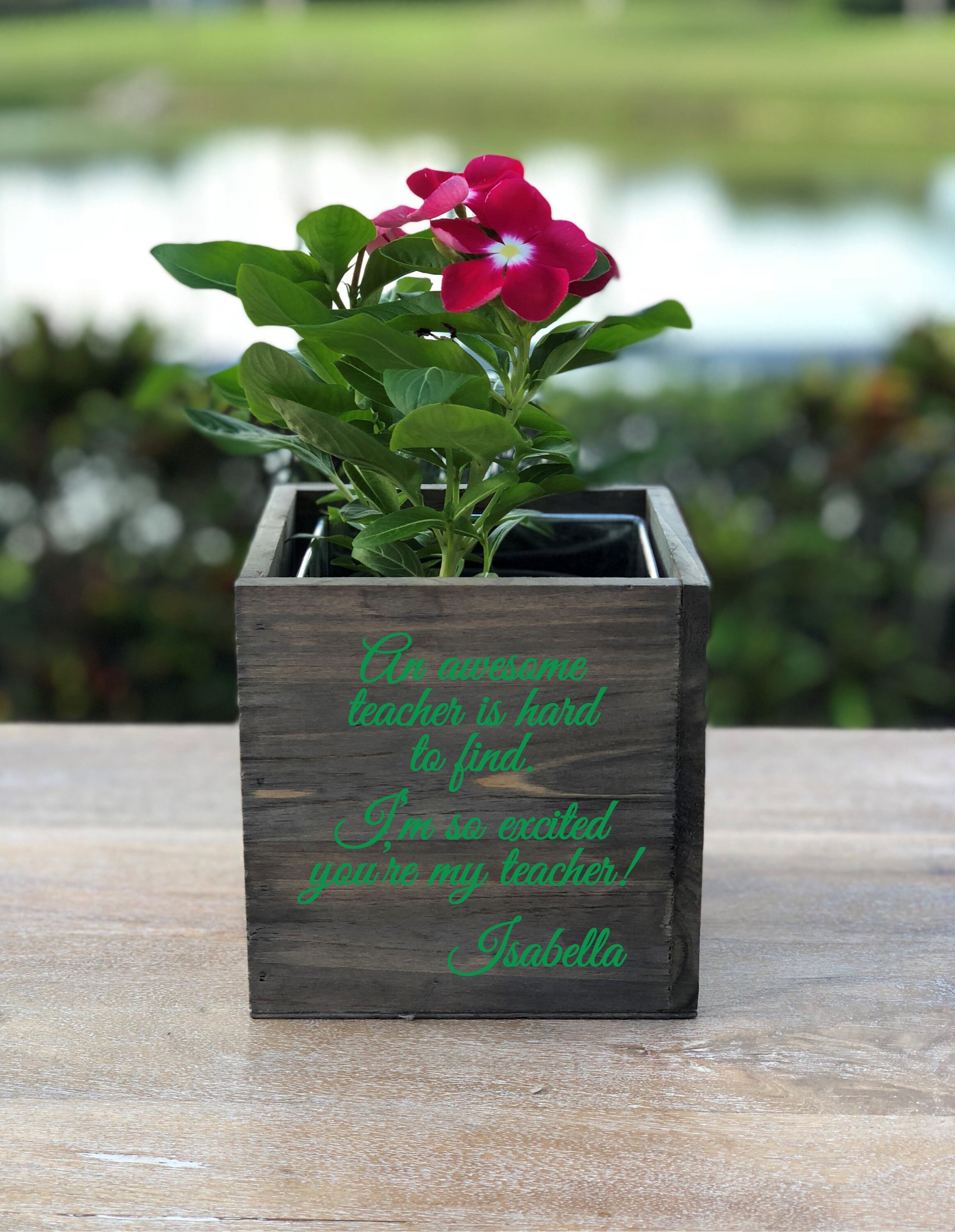 Lovely natural wood planter holder that measures 5"x5"x5" - perfect to hold flower arrangements or a plant! This would make a great gift for that special teacher. Choose the stained wood as shown, or let us paint it your favorite color.