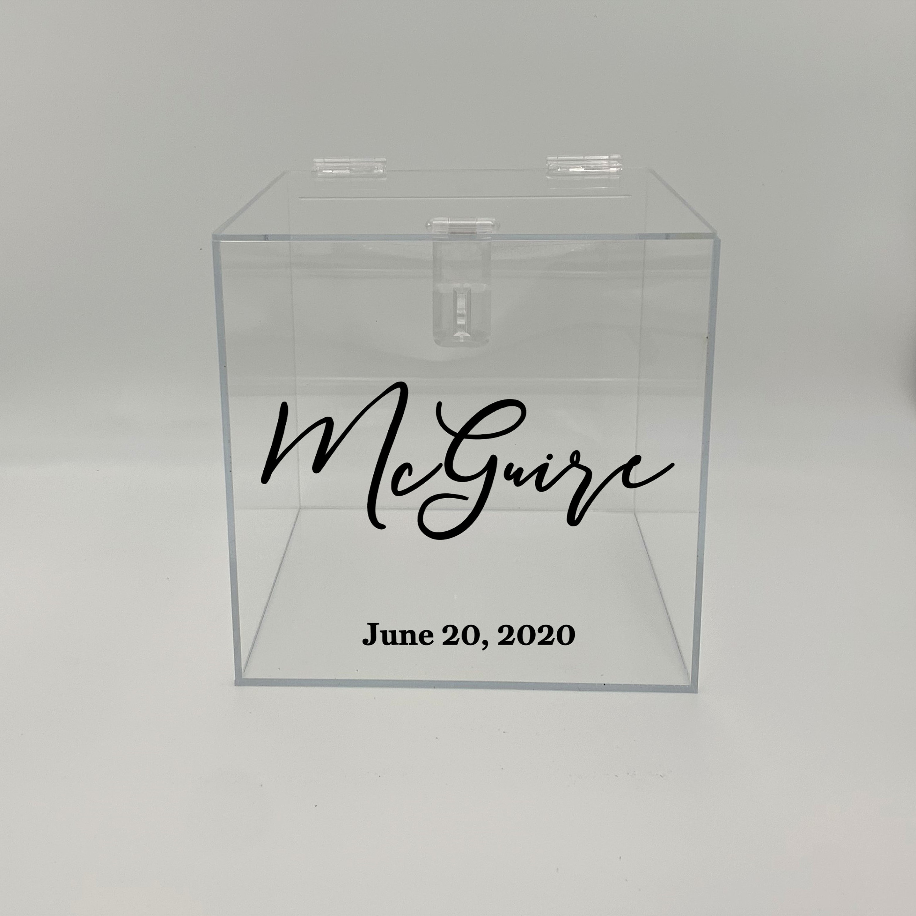 Beautiful clear acrylic card box would make the perfect decoration for your wedding! Personalized with any Last Name and Date in the color of your choice. Choose from our solid, metallic or new sparkle colors. We also offer the card box blank with no personalization. Each box is handmade and polished from clear acrylic and features a 7" card slot.