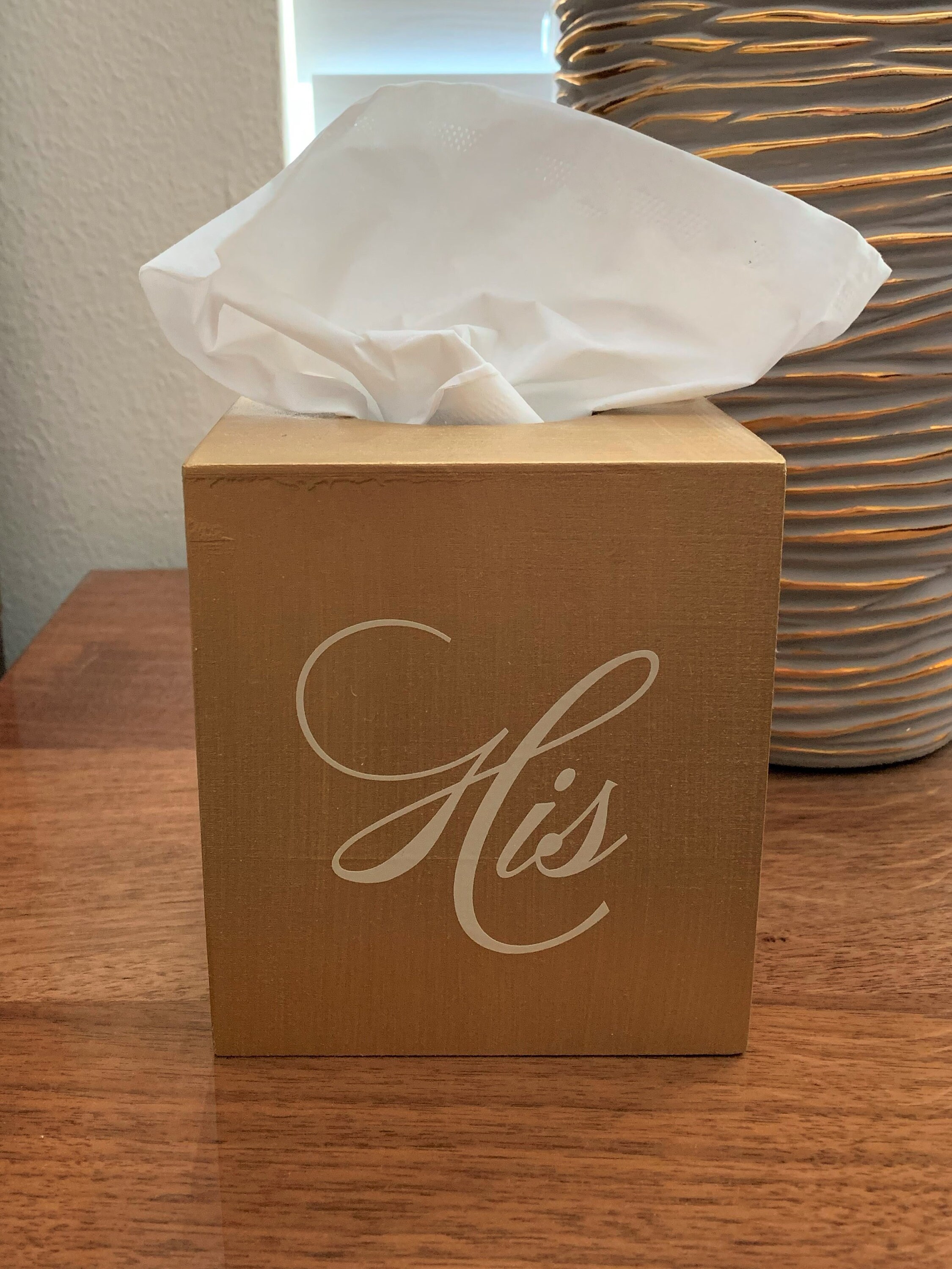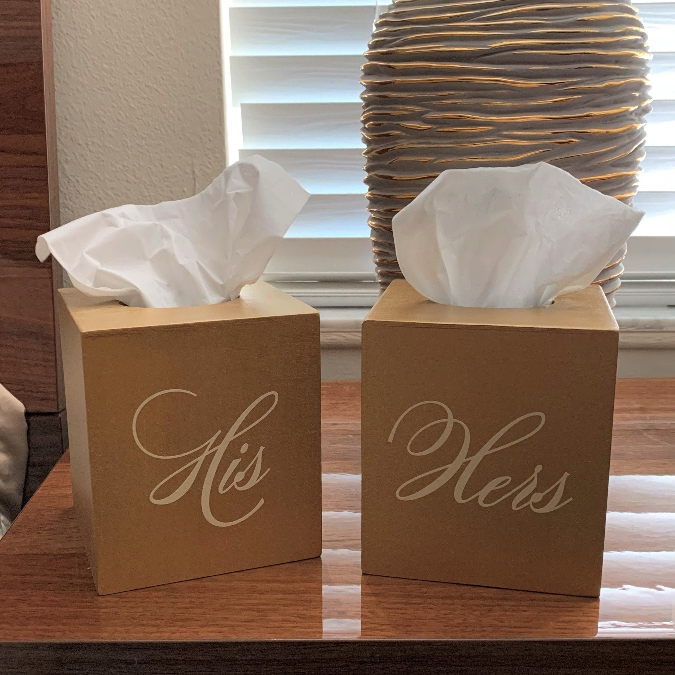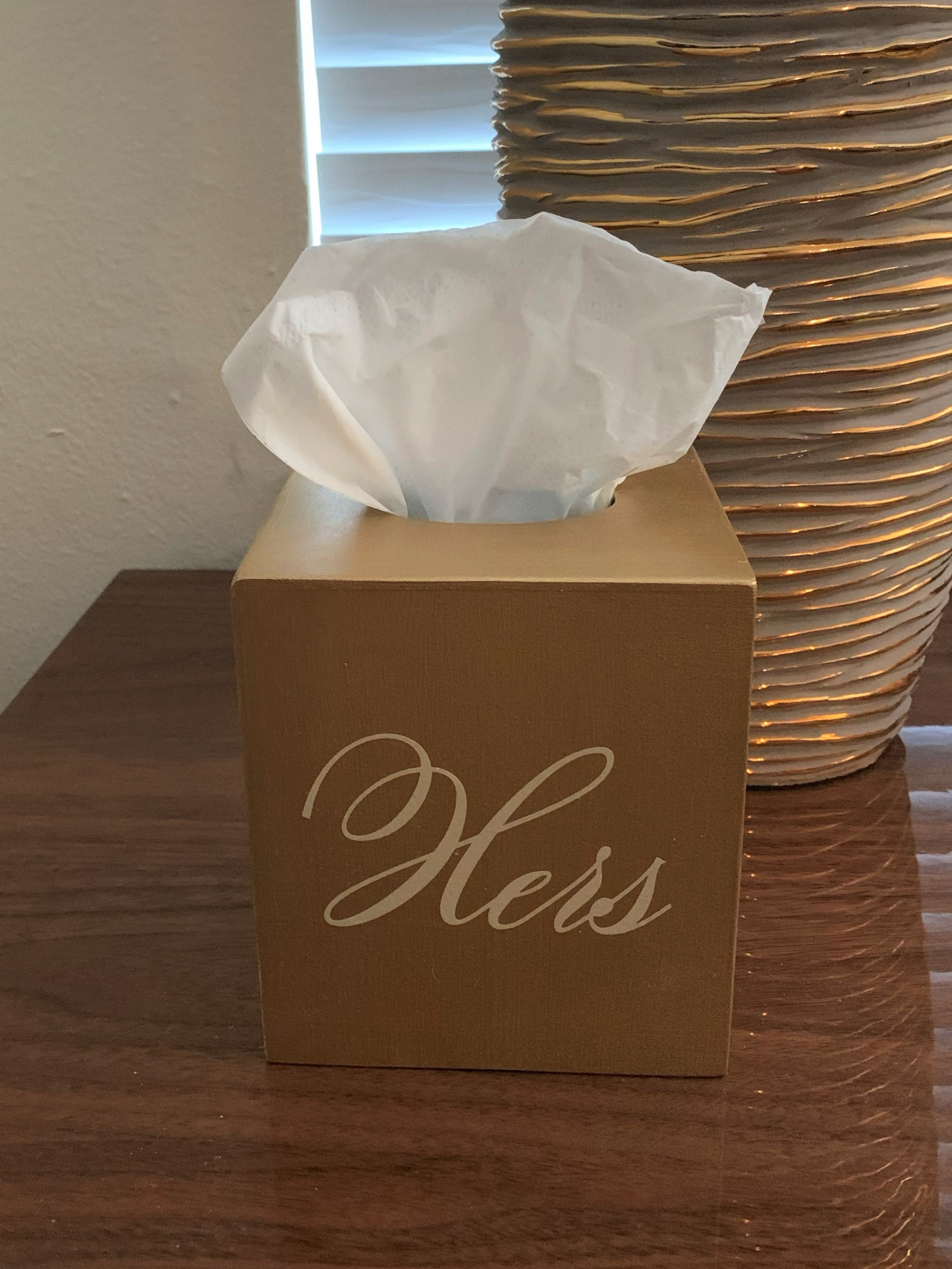 This is a beautiful oversized tissue box cover that you can order individually or as a set. They are painted in your favorite color with the lettering in the color of your choice. Match your home décor. It accommodates a standard square box of tissues. This would look great on your nightstand or by your master sinks or anywhere else in your home.