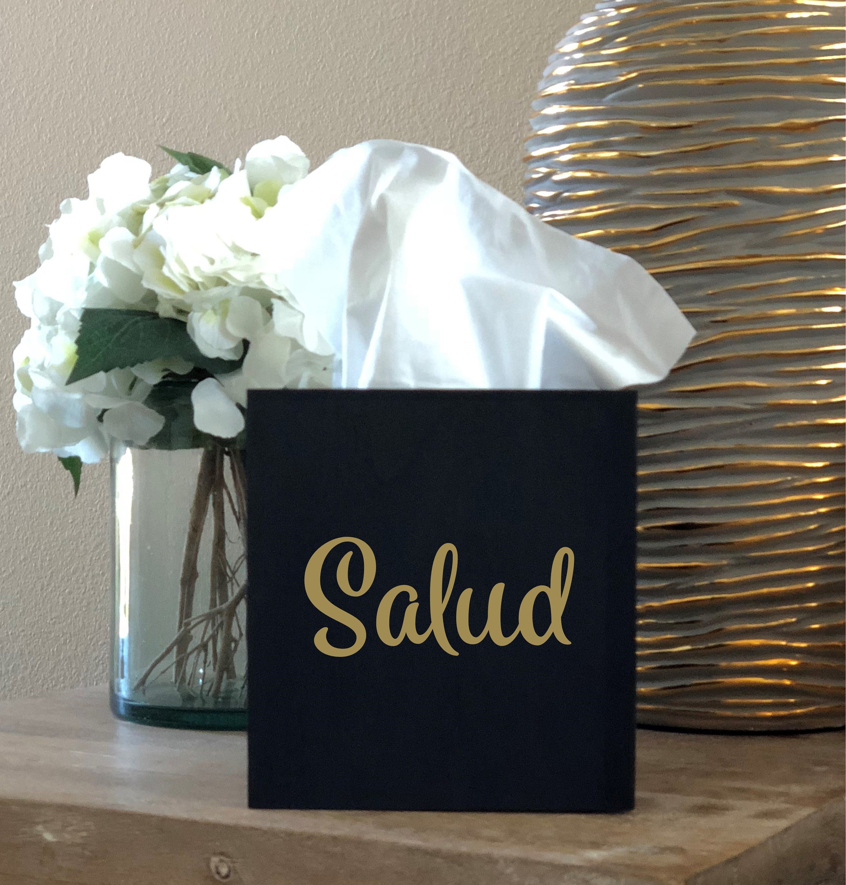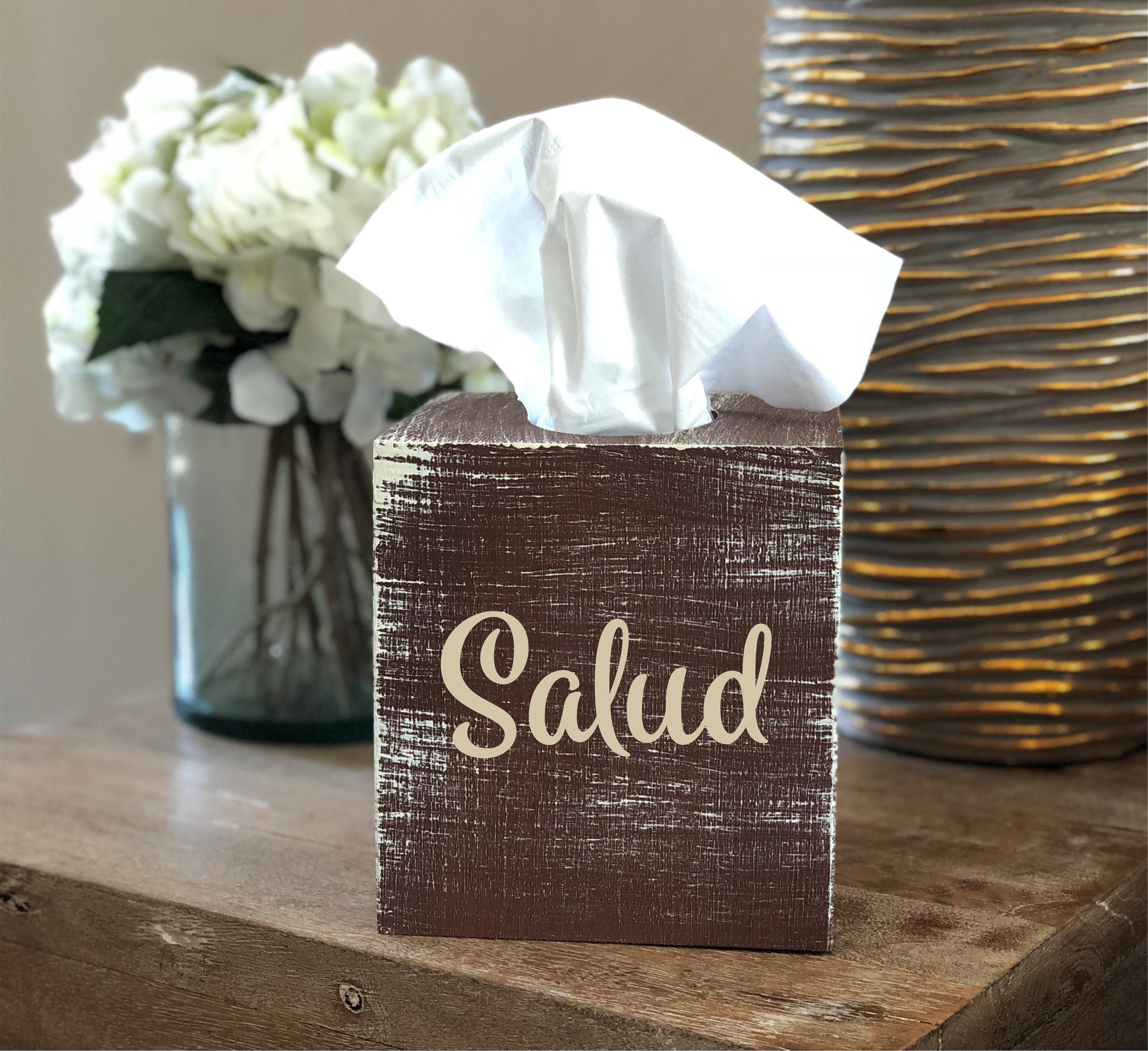Beautiful tissue box cover. It is painted in your favorite color with the lettering in the color of your choice. Match your home decor. It accommodates a standard square box of tissues. Measures 6" square and is 6" tall.