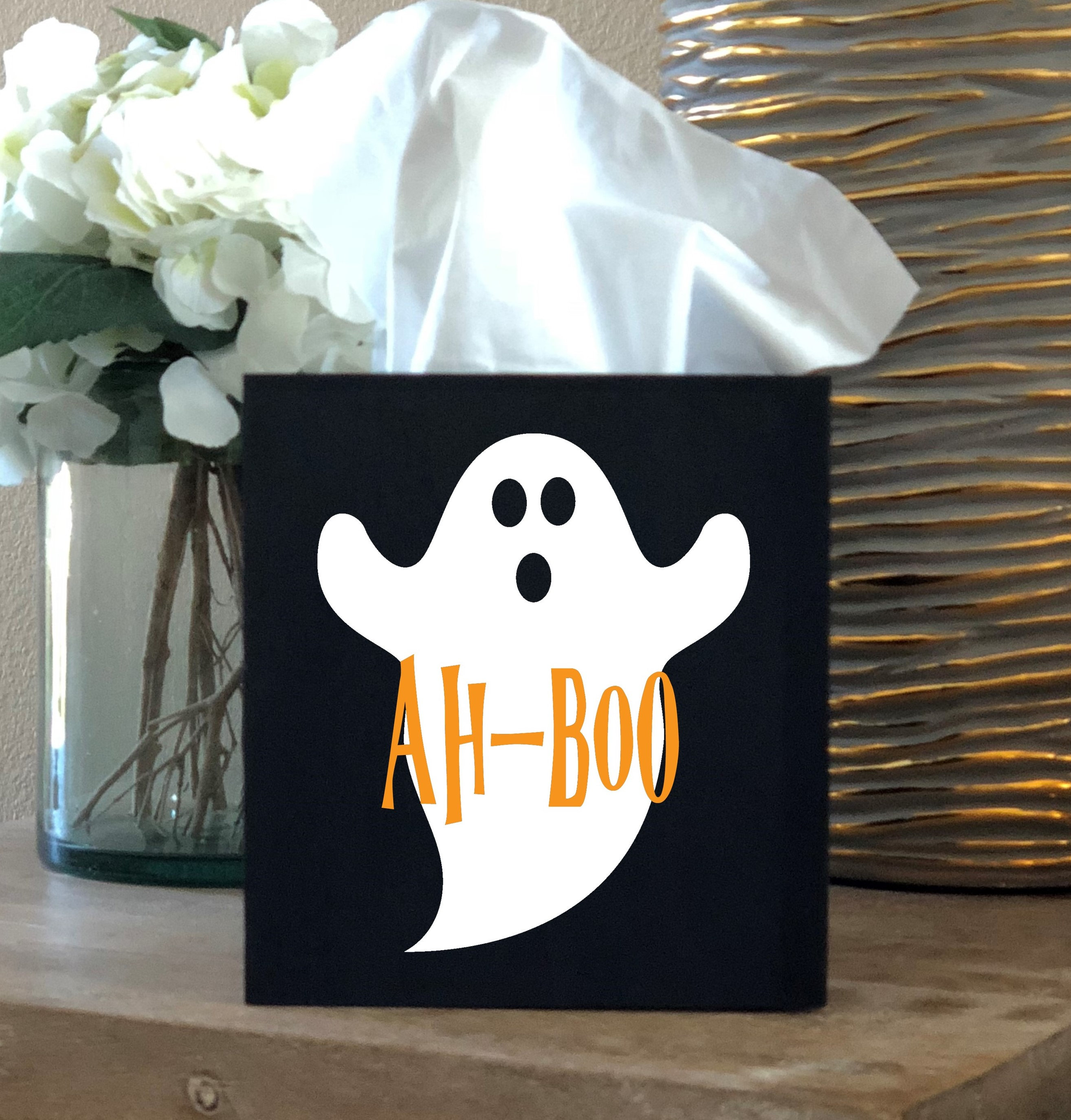 Celebrate Halloween with this beautiful Halloween oversized tissue box cover. It is painted in your favorite color with the ghost and lettering in the color of your choice. Match your home décor. It accommodates a standard square box of tissues. This would look great on your end table, nightstand, desk or anywhere else in your home of office.